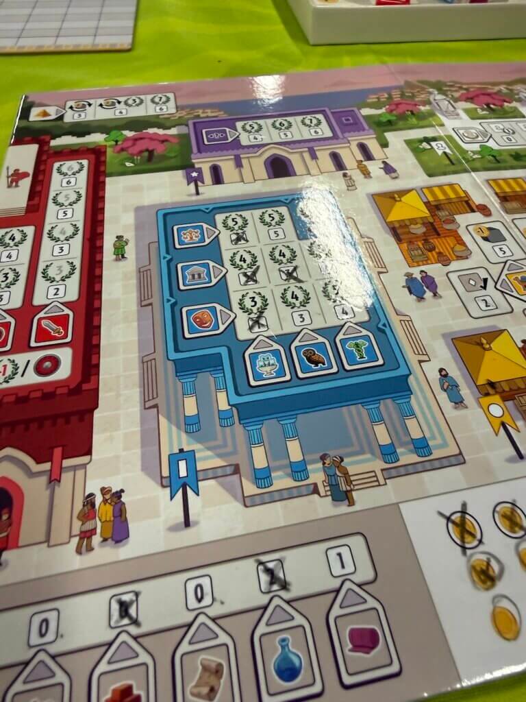 Globalement, on retrouve les couleurs et habitudes de 7 Wonders mais bien twisté dans ce roll & write aux sensations très différentes. Les ressources sont gagnées immédiatement et restent valables toute la partie, utilisable une fois par tour. La zone bleue, va permettre de cocher la case la plus proche correspondant à l’icône du dé encore non coché et faire de plus en plus de points. La zone verte, sur 3 lignes va donner des réductions de coûts, des pouvoirs ou permettre de remplacer un dé de ressource par un dé spécial. La zone rouge, militaire, de combattre ses adversaires, soit à gauche, soit à droite (en fonction de l’icône du dé), ou de se protéger d’un côté ou de l’autre. La zone jaune, le marché, va permettre de réduire le coût des dés, de gagner des points suivant le nombre de ressources cochés par exemple. Sa merveille permettra de ne pas prendre de dé et de faire le pouvoir le plus à gauche encore dispo (3 pouvoirs par merveille). Les 3 dés spéciaux, accessible par la zone verte, permettront d’avoir accès à la zone des guildes en cochant si nous avons plus de coche que nos adversaires directes sur la zone désignée par le deux, le dé de la galerie des doubles coches dans certaines zones et le noir, pas mal de bonus encore. Bref, assez complet dans la pure lignée des bons roll & write.