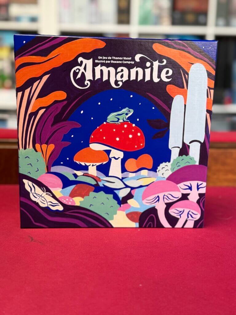 Avec un design très particulier puisque entièrement réalisé à la gouache par Roxane Campoy, Amanite est assez atypique. Il l’est aussi dans la mécanique, puisqu’on retrouve un peu de guessing et de bluff bien sournois pour observer les réactions des partenaires ainsi que leurs choix à chaque étape du jeu. Il encourage à parler pour orienter ses adversaires vers de mauvais choix. La gestion de l’équilibre entre Poison et Antidote est savoureuse et va vous faire suer sur la fin de partie pour essayer de ne pas être éliminé !