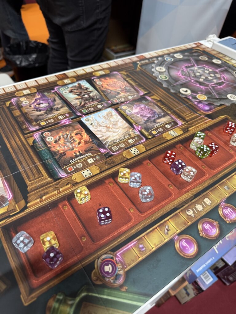 Dans les plus gros morceaux, The Voynich Puzzle est vraiment l’expert qui nous tente le plus, Chimerium à venir chez Synapses (plutôt initié) s’annonce aussi excellent. Tout comme Coming Of Age chez Ludonova qui retrace le parcours de l’adolescence dans un jeu expert ! Soothsayers avec son jeu de tarot chez Fentasy games à l’air excellent, mais l’unique table était inaccessible. First Rat, malgré le nombre de tables présentes avait toujours 4/5 tables complètes qui attendaient de pouvoir y jouer … Nous n’avons toujours pas réussi à tester Salamandra chez Grrre Games, ni Ice (dont la livraison ne saurait tarder) chez This Way, ni le futur Magical Athlète (Athèle de compét …) chez Iello qui s’annonce complètement débile. Et je n’ai trouvé ni Savage Bowl, ni Origin Story, que je voulais tester du côté de PTS distribution.