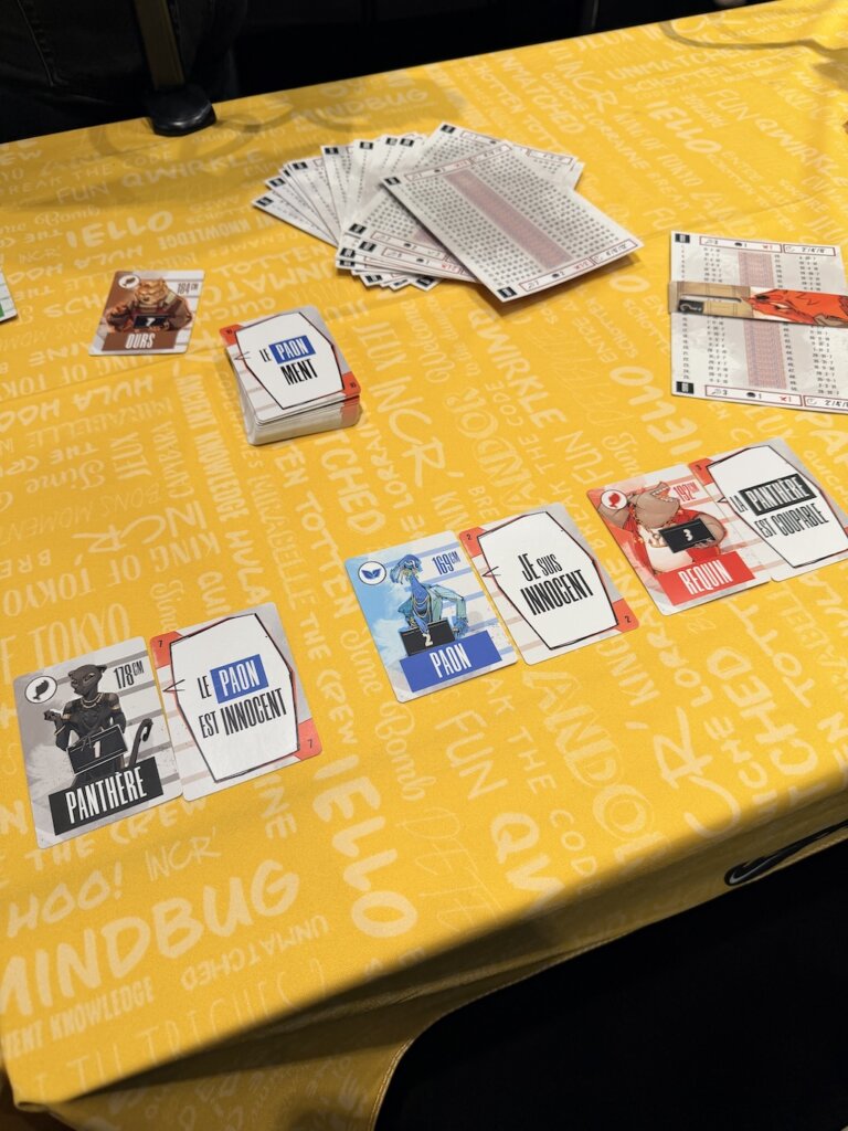Dans les jeux 2 joueurs, nous n’avons pas pu tester Bunny Kingdown Town (les files d’attentes étaient dingue), ni Skyrift, le nouveau Richard Garfield chez Origames qui a l’air d’avoir eu un sacré succès (dont j’ai oublié de prendre des photos 🙈). On a bien aimé l’idée du jeu de détection coopératif Le coupable est un carnivore chez Iello sinon, à creuser (vous avez une énigme à faire sur la photo à partir des 6 cartes du bas).