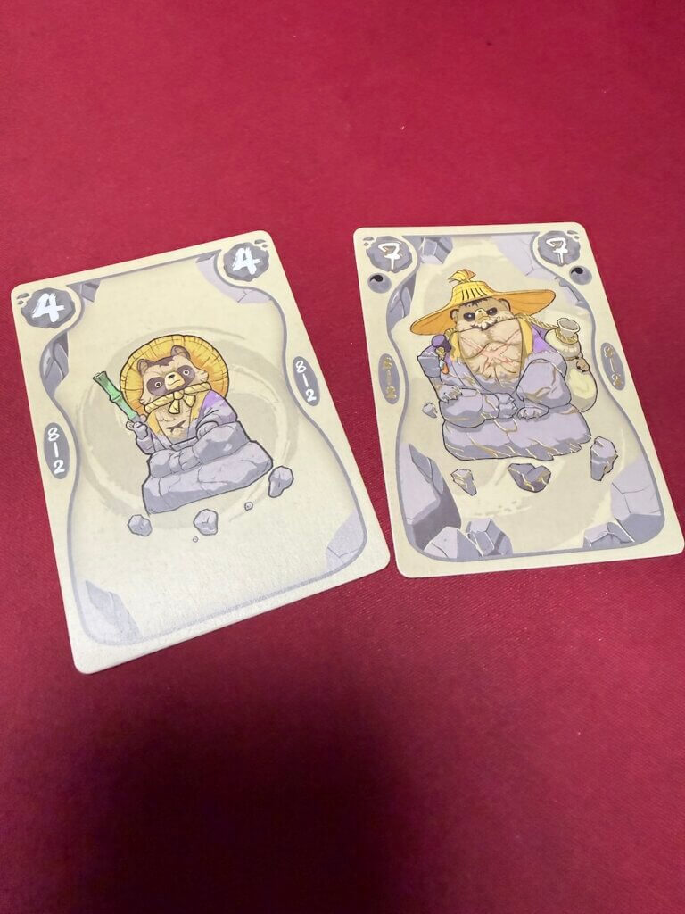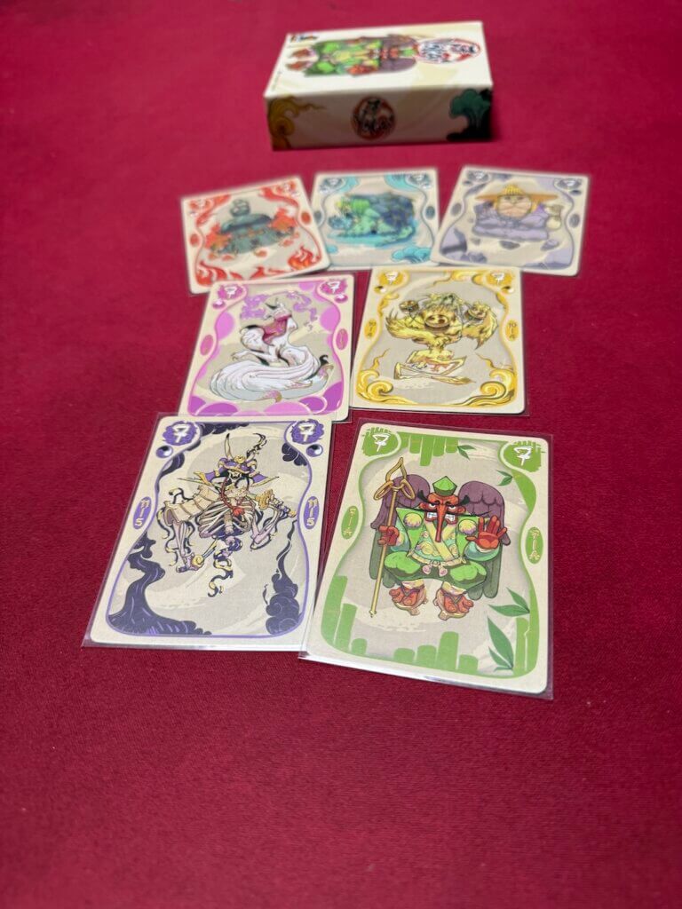 C’est l’histoire d’un jeu de pli qui se fait un délire autour du chiffre 7. 7 couleurs, comprenant chacune 7 cartes, décalées de 1 les unes avec les autres (Vert de A à 7, Gris de 2 à 8 etc), ou chacune des couleurs représente une famille de Yokai et où la carte de valeur 7 de chaque couleur représente le Boss. Boss qu’il faudra capturer. Pour être exacte, il faudra même avoir une majorité de 7 pour l’emporter (soit 4 vu qu’il y en a 7).