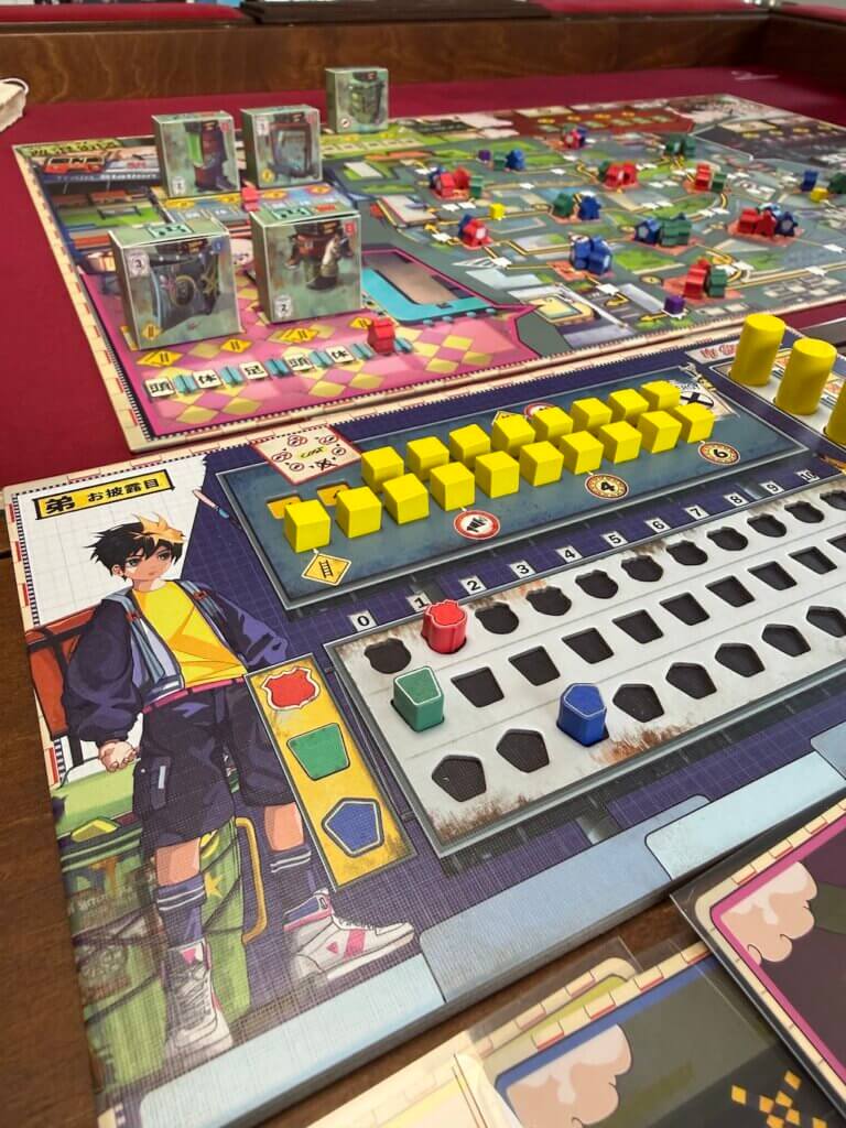 Toute la difficulté du jeu va être de gérer nos cartes Actions, car ce sont elles qui définissent de quel quartier on part, puis ensuite de construire correctement notre réseau de rue à l’aide de nos cubes “Distributeurs de Flyers“. Car pour attirer des Fans, il faudra avoir des éléments de Kikai de la même couleur et avoir un réseau (à notre couleur, ou passant par celui du joueur adverse en payant 1 énergie par cube adverse utilisé) pour les ramener jusqu’au lieu d’exposition.