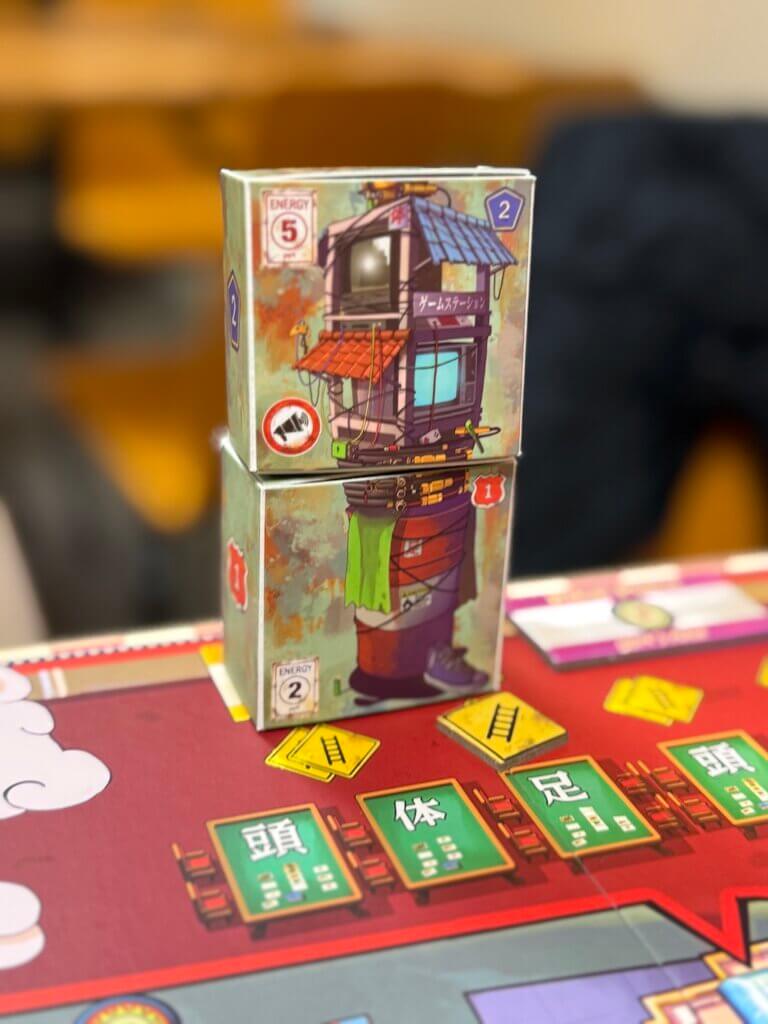 Les Kikai vont être construits en commençant par les pieds, puis le corps, puis la tête. Chaque élément va ramener de l’influence dans une des trois couleurs du jeu (rouge, vert ou bleu, correspondant aux couleurs des Fans) (soit directement pour les pieds, soit en plaçant des jetons Échelles en nombre suffisant pour atteindre le corps ou la tête). Il y a une course dans chaque Quartier, car le 1er à poser un élément tête dans un quartier, remportera une tuile bonus avec de précieux PV. On perdra aussi des points pour les Quartiers où nous n’avons pas construit de pieds.