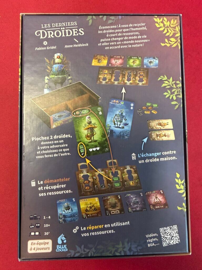 Les derniers droïdes est un jeu de cartes et de collection dans un univers post-apocalyptique où l’on incarnera des Écomécanos, artisans et artisanes d’un « nouveau monde » visant à réduire l’extraction de matières premières de notre planète ! Notre objectif : recevoir la médaille de l’ordre de la feuille, en construisant, réparant ou recyclant des robots.