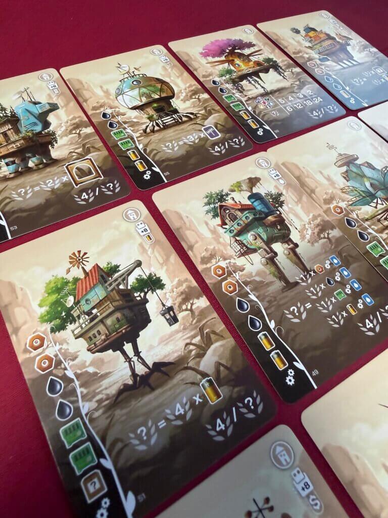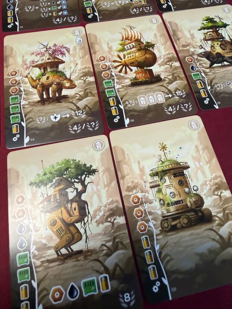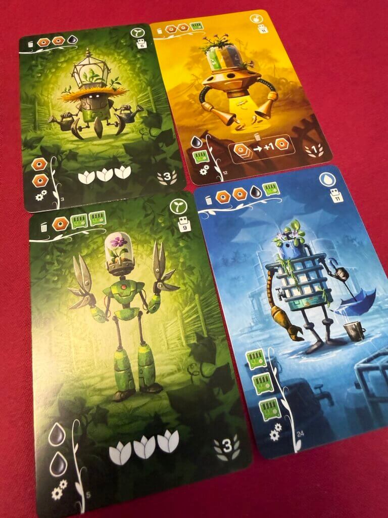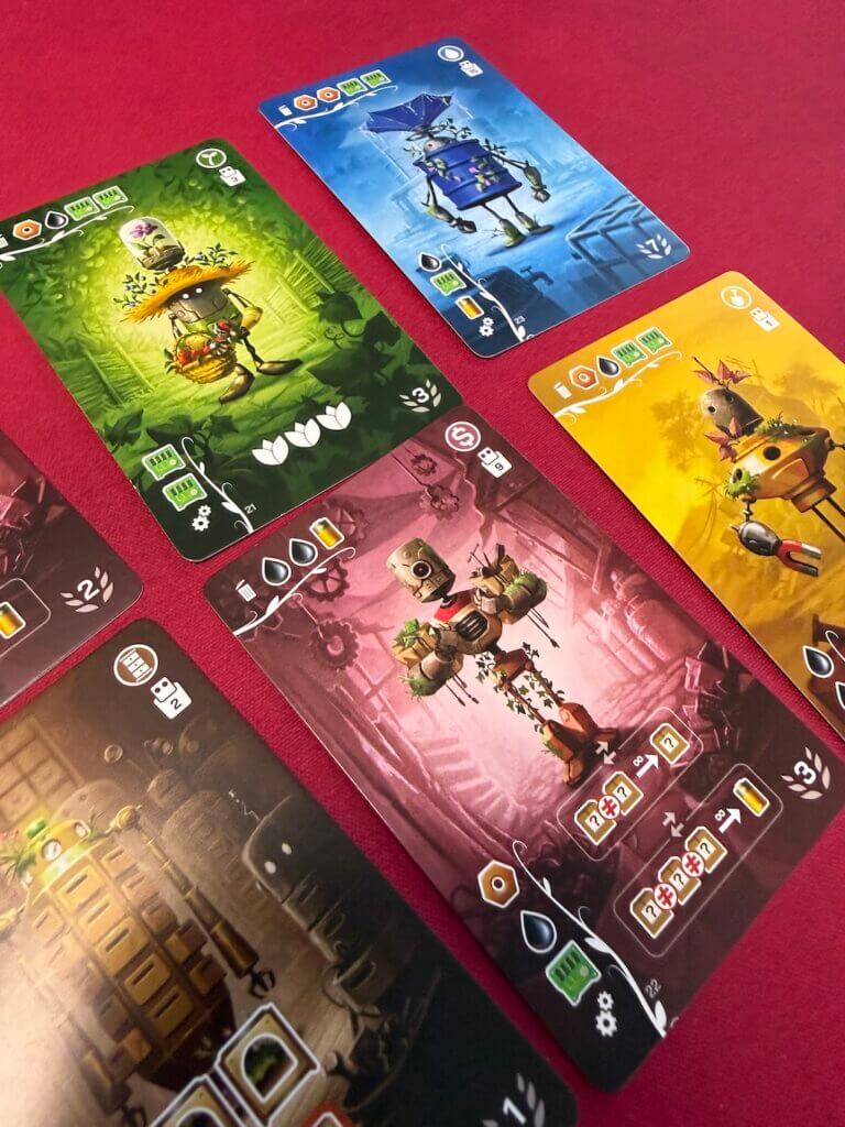 Chaque famille de robots va avoir différents types de pouvoir (de fin de partie en fonction de la défausse, d’échange de ressources, donner des plantes, … ). Plantes qui rapporteront des Piles (la ressource joker) à chaque fin de manche au joueur en ayant la majorité.