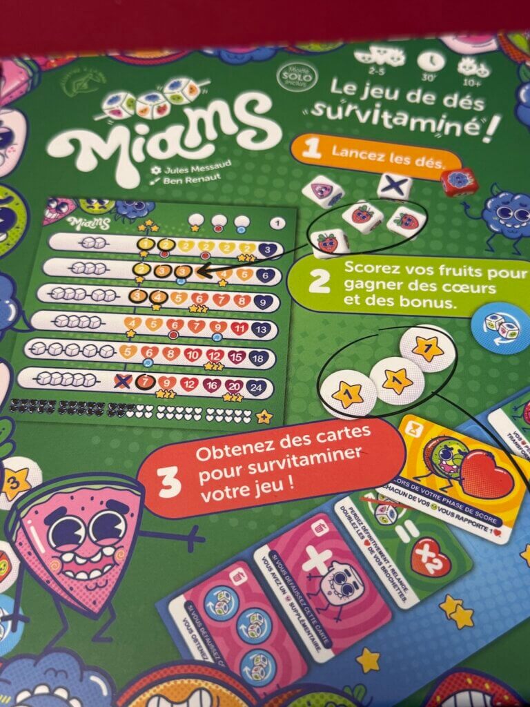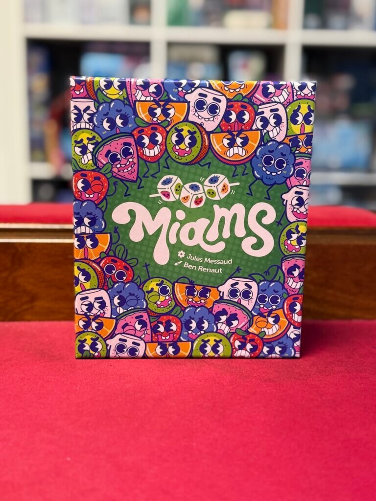Miams est un jeu de Yams dopé aux amphétamines, dans lequel il va falloir tenter de faire, chaque tour, des brochettes de fruits (des combinaisons) à partir de lancer de dé, en s’aidant de cartes à pouvoir qui vont twister les règles du jeu en continu.