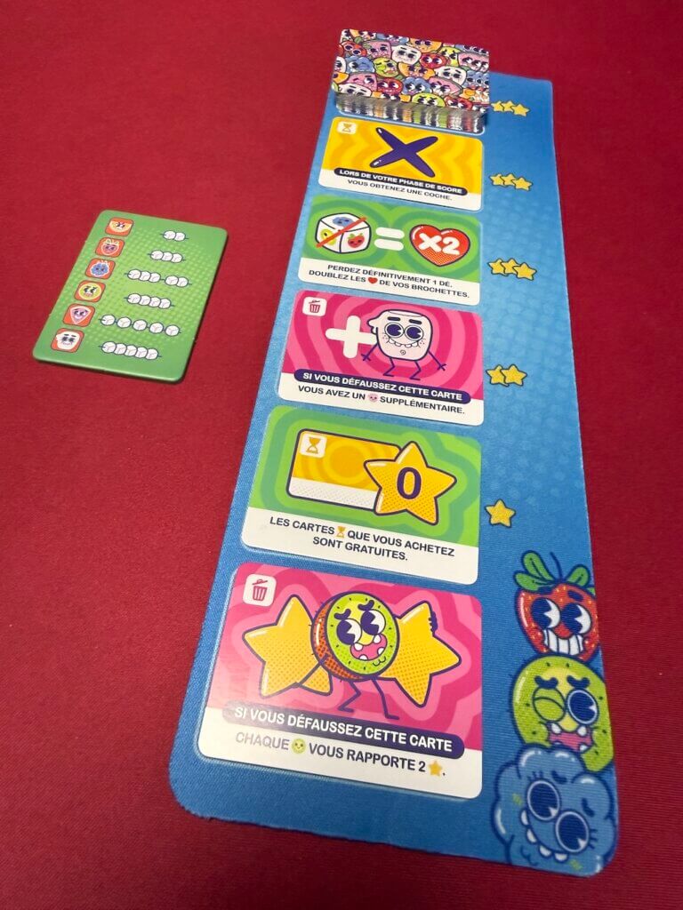 Ensuite vient la phase d’achat, qui permet au marché, en payant le coût en étoile demandé (de gratuit pour la 1ère à 3 étoiles), d’ajouter une carte à côté de notre plateau, dont les effets (actifs, de défausse ou de scoring) s’appliqueront dès le prochain tour et vont se cumuler aux cartes achetées précédemment.
