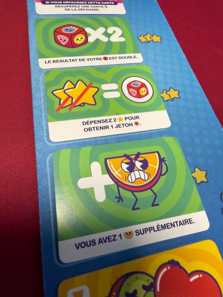 Les bonus permettent d’avoir un jeton avec des étoiles (la monnaie du jeu), le jeton dé rouge (afin d’avoir un dé supplémentaire sans croix, avec même un fruit joker), et un jeton de relance pour une relance supplémentaire.