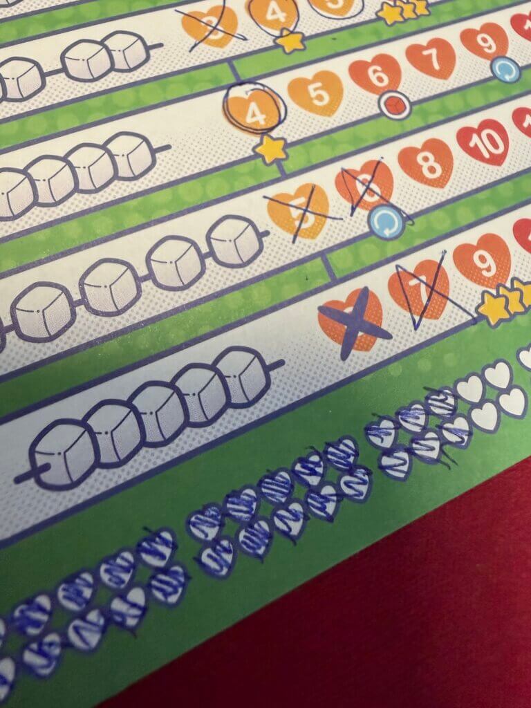Avec une fiche de score dont le départ est asymétrique (une coche aléatoire présente dans la 1ère colonne), chaque joueur va enchainer les tours de jeu jusqu’à ce que l’un d’eux atteigne les 50 cœurs. On finira le tour en cours et celui dont l’addition des cœurs et étoiles restantes sera la plus grande, l’emportera.