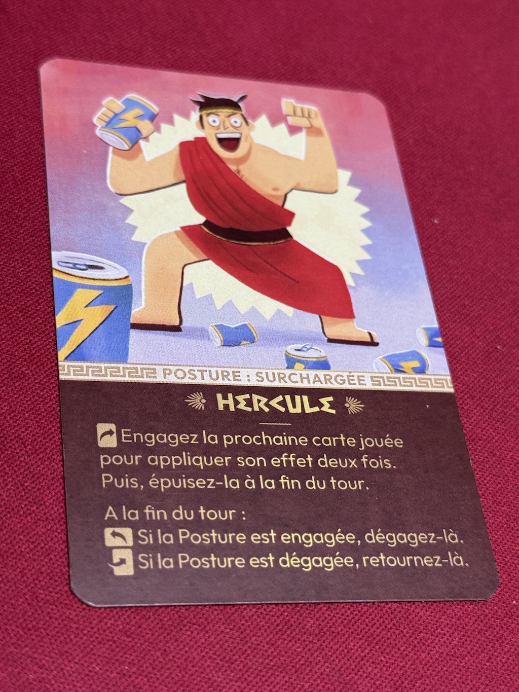 Nous allons d’abord retrouver les 12 travaux d’Hercule qu’il faudra affronter un par un dans un ordre aléatoire. Ces Travaux vont avoir une attaque de départ, un nombre de points de vie, et une valeur de défense. Nous allons avant de démarrer en sélectionner un aléatoirement, puis constituer un deck de 10 cartes avec exclusivement des cartes d’attaques (Frappe), de défense (Blocage) ou d’amélioration (Entrainement). À nous d’en choisir la répartition en fonction du Travail que l’on va affronter cette manche. Les cartes restantes formeront une réserve qu’on pourra ajouter à notre deck plus tard.