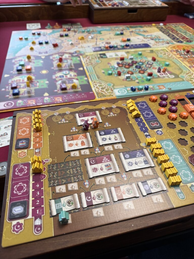 Le jeu fourmille de pistes en tout genre et de possibilités, au point de provoquer assez facilement l’Analysis Paralalysis devant tant de choses à faire. Comptez 1h par joueur, mais soyez rassuré, car ce sont d’excellentes heures ! On le recommandera toutefois à 2 ou à 3 plutôt qu’à 4, tant certains tours, entre A.P. et combo en tout genre, peuvent durer. Mais une fois passées ces quelques petites difficultés et peut-être un manque d’épure à certains endroits, le reste n’est que du plaisir avec un jeu très gourmand et généreux ! Que ce soit en matériel (ou en place sur la table), avec un nombre de cartes énorme, en asymétrie, avec 14 personnages très différents, ou en espace décisionnel à chaque tour. La règle est aussi un véritable modèle du genre. L’intrication entre les pistes, ressources et actions est savoureuse et rappelle à certains moments du Lacerda, preuve qu’on est quand même dans du gros expert, qui tâche. Soyez prévenu, ça n’est pas pour tout le monde, c’est encore au-dessus de monstre comme Ark Nova en termes de complexité, mais ceux qui s’accrochent (et qui réussissent à mettre la main dessus) ne seront pas déçus.