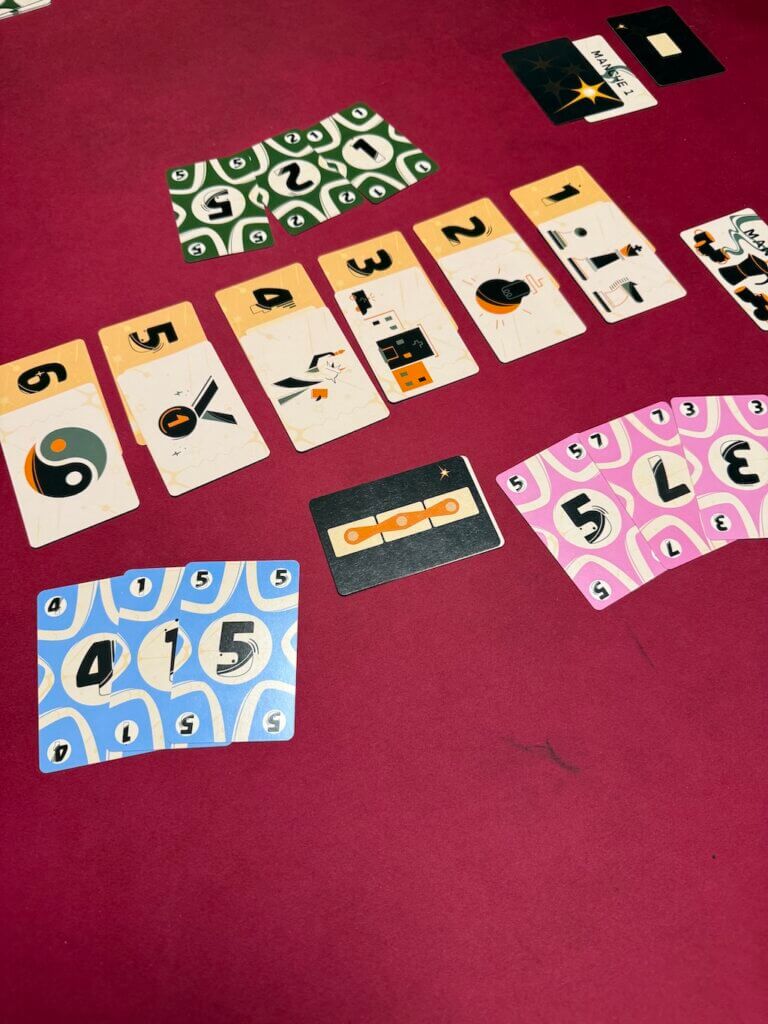 Une fois que l’on décide de regarder ses cartes, nous n’avons plus le droit de discuter et la partie commence. Un joueur qui le décide, peut démarrer et place une carte face cachée sur un des 6 cadrans. Ensuite, dans le sens horaire, le joueur suivant doit lui aussi en poser une (là où il le souhaite, pas de contrainte de ce type au départ). Et ainsi de suite jusqu’à ce que toutes les cartes en mains des joueurs soient placées. Suivant le nombre de joueurs, nous aurons aussi le droit de jouer un certain nombre de cartes visible. À nous de définir, soit pendant la discussion stratégique, soit à chaud, quand et laquelle jouer visible pour donner de précieuses informations à nos coéquipiers.