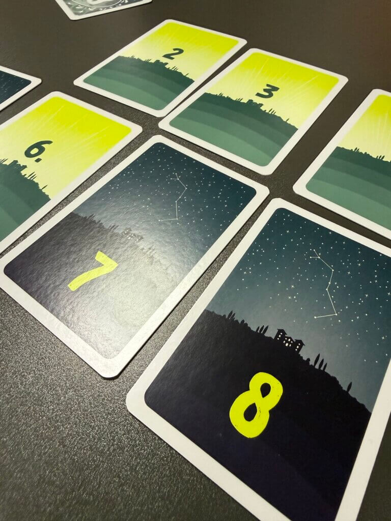 Au centre de la table, des cartes numérotées croissantes en fonction du nombre de joueurs (1 à 8 à 5 joueurs par exemple) positionnées sur leurs faces Nuit. Devant chaque joueur, une carte Porte côté Ouverte.