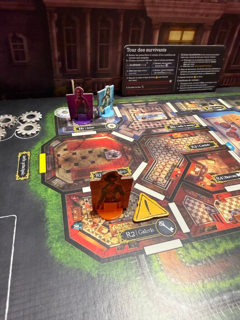 Le gameplay est finalement plus simple qu’il n’en a l’air. Les survivants font leurs tours ensemble, en réalisant une action chacun dans l’ordre de leurs choix (parmi 6 comme se déplacer, retirer ses peurs, enlever un obstacle, etc), des actions gratuites potentielles (échange d’Objet ou actions supplémentaires du personnage ou d’Objet qu’ils portent). Ils devront en fin de tour indiquer au tueur dans quelles pièces ils ont fait du bruit.